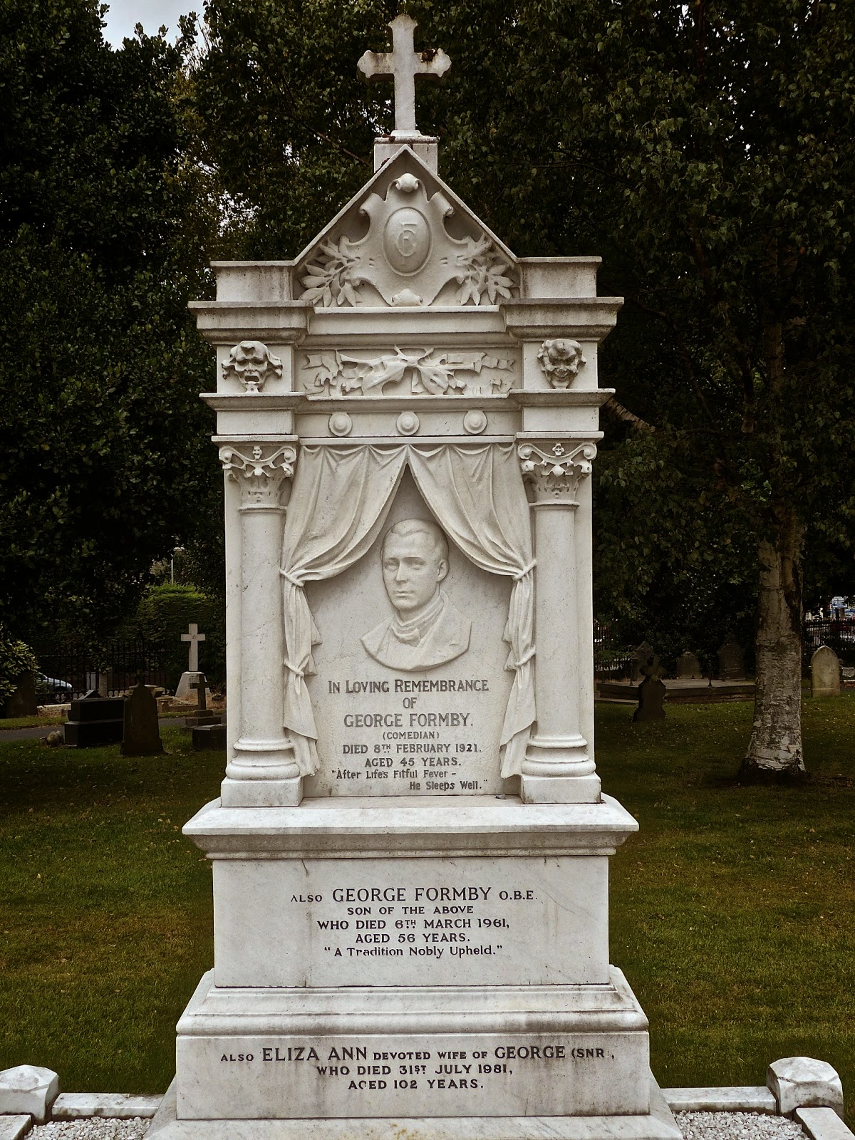 The striking memorial to the popular entertainer George Formby stands in Warrington Cemetery, Cheshire. His career spanned four decades from the early 1920s to his death in 1961. He was a famous music hall and film star and entertained the troops during the Second World War. George’s funeral brought the whole of Warrington to a standstill, with an estimated 150,000 admirers lining the route! He was buried with his father whose magnificent white marble memorial headstone was unveiled in October 1922., George Formby Senior was also a star of the stage.